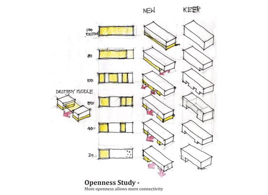 The proposal then suggested making a new intervention which comprised three pronged programmatic: incubator offices, place for interaction and open/ green space. The defunct Alfred Place Street was chosen as the site for this intervention, which was currently used inefficiently as parking or service area, whereas it enjoyed high level of connectivity, prominent location and interesting history, which together provided it potential to play a better role in the city urbanism.