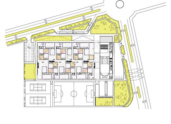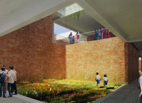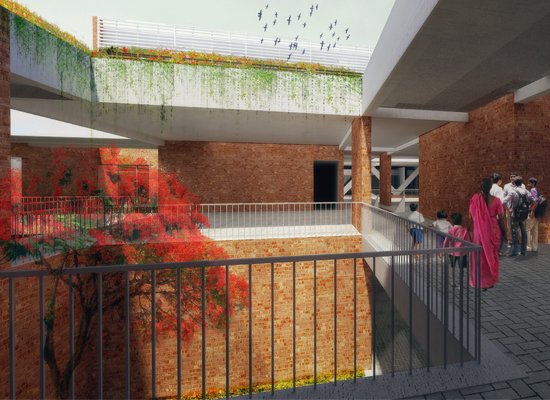 The school design is based on a modular concept that is adjusted according to area and requirement of each site. In addition to conventional learning areas such as classrooms, the building concept also provides spaces for Eco learning as well as Social learning creating an environment that is conducive to enhanced development of students. Each school comprises of a Ground+1 Academic Block and a taller Administrative Block. The Academic Block is designed as a cluster of repeating modules of classrooms that are arranged around courtyards on both ground and upper level. These courtyards are intelligently landscaped to provide opportunities for varied learning. The social interaction spaces along the central corridor increase chances of interaction between different school students. The Administration Block integrates the auditorium, offices, library, gym, indoor swimming pool and terrace sports areas. The building exterior is finished with exposed brickwork, while the interior contrasts with well finished appearance.